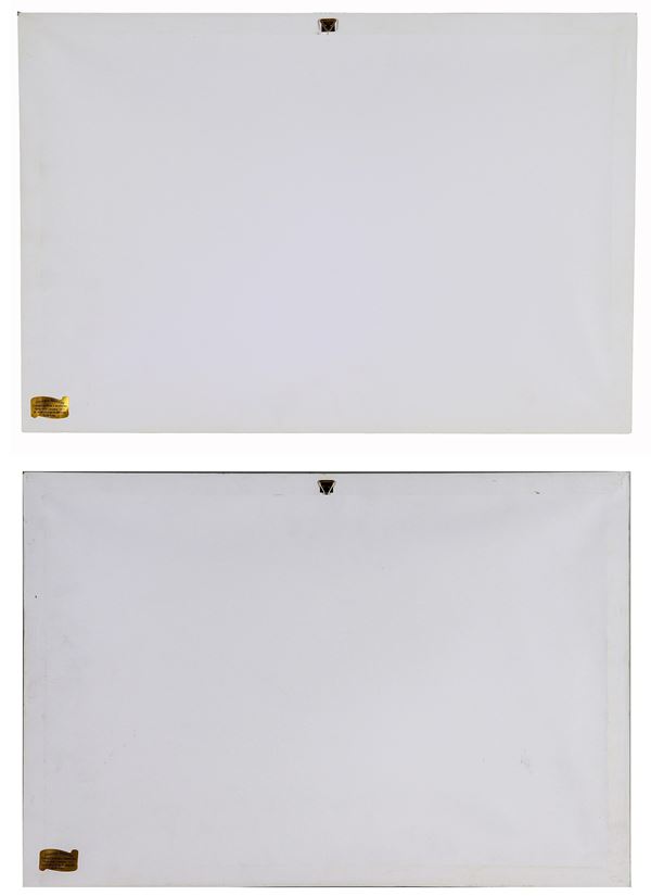 cornici in legno dorato e vetro, cm 34 x 52 ciascuno.