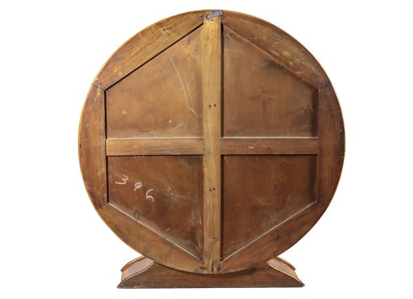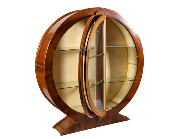 Vetrina di linea Decò a forma tonda in noce, con due sportelli a mezzaluna e ripiani in cristallo all'interno