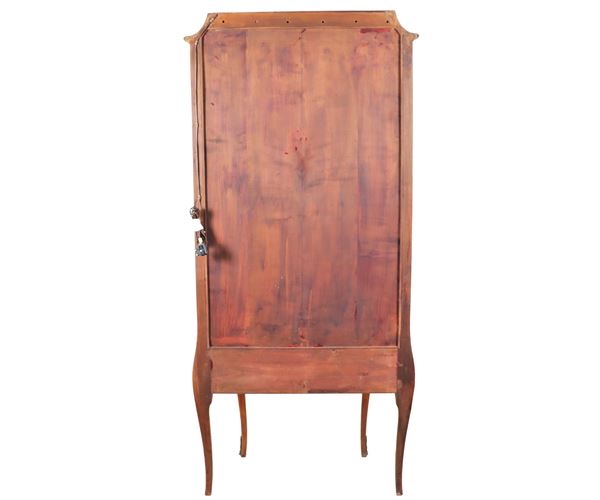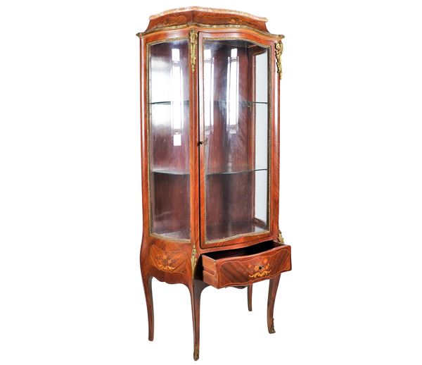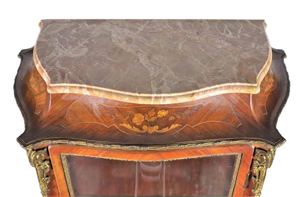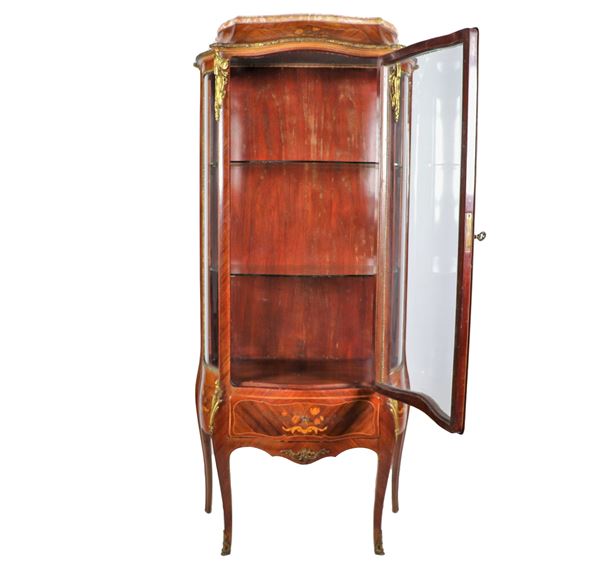 Vetrina francese di linea Luigi XV in bois de rose ed ebano viola, con intarsi a motivi floreali e fregi e guarnizioni in bronzo dorato, pianetto [..]