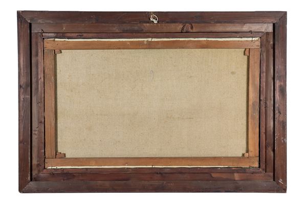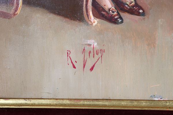 Firmato. "Interno di palazzo patrizio con il concertino dei nobili", luminoso dipinto ad olio su tela eseguito con tratto minuzioso