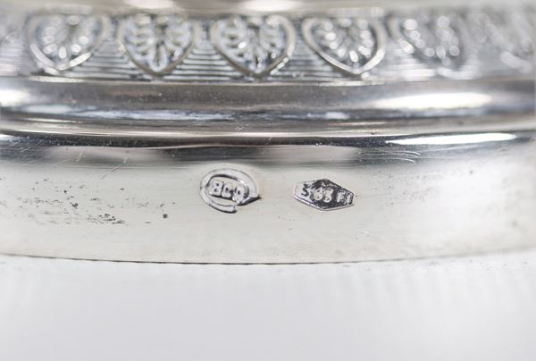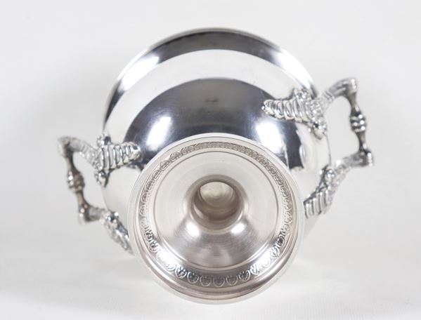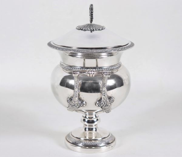 Zuccheriera a forma di anfora neoclassica in argento sbalzato e cesellato a motivi Impero, gr. 630