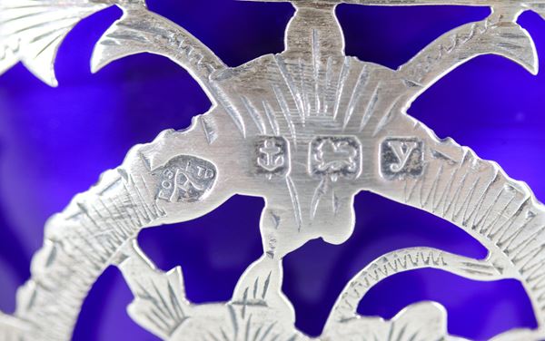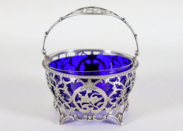 Zuccheriera in argento con manico Epoca Giorgio V, cesellata, sbalzata e traforata, vaschetta in cristallo blu cobalto, gr. 110
