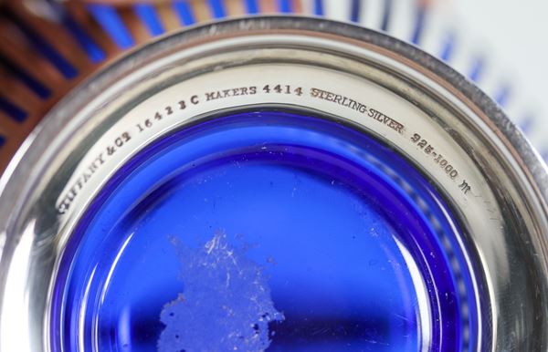 Zuccheriera in argento traforato Sterling 925 con manico, vaschetta in cristallo blu cobalto, gr. 170