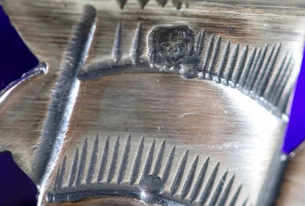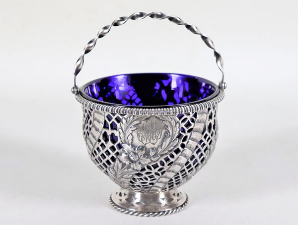 Zuccheriera tonda in argento, cesellata, sbalzata e traforata, con manico a tortiglione e vaschetta in cristallo blu cobalto, gr. 190