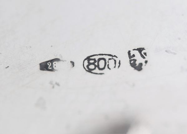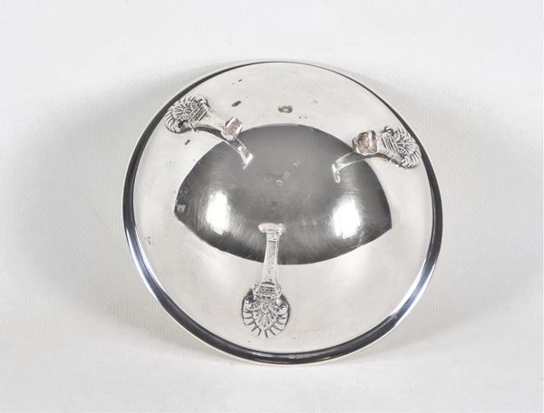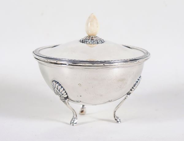 Zuccheriera tonda in argento cesellato e sbalzato a motivi neoclassici, sorretta da tre piedini ricurvi, gr. 380
