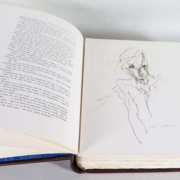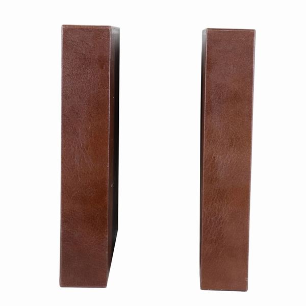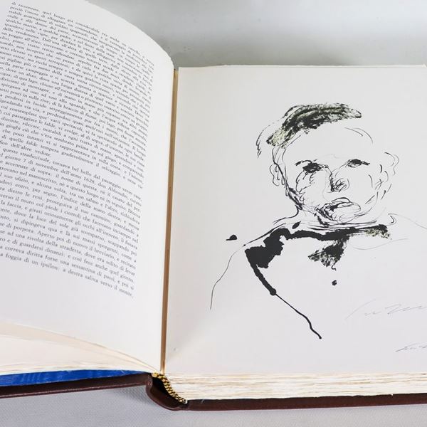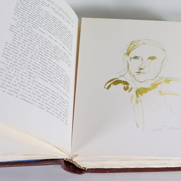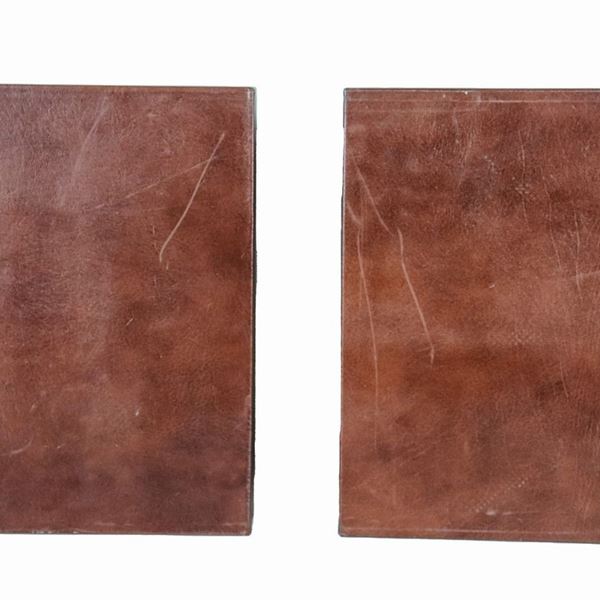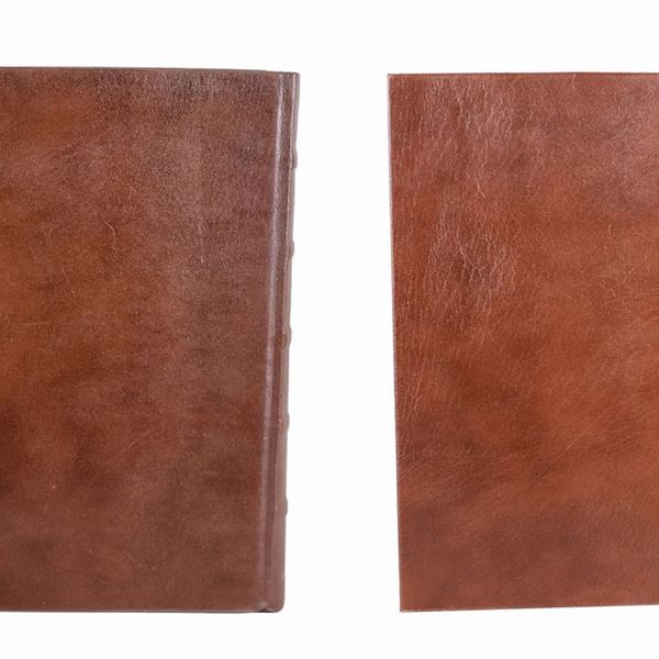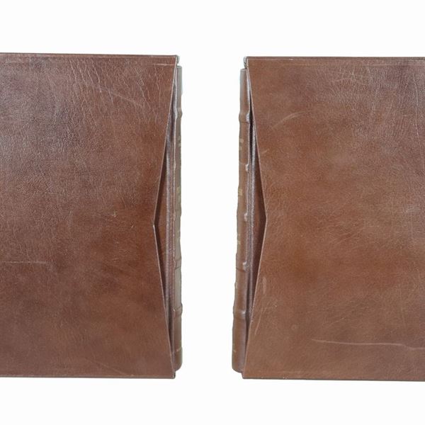 Rilegatura in pelle, titoli in oro e cofanetti in pelle, cm 33 x 43 ciascuno.