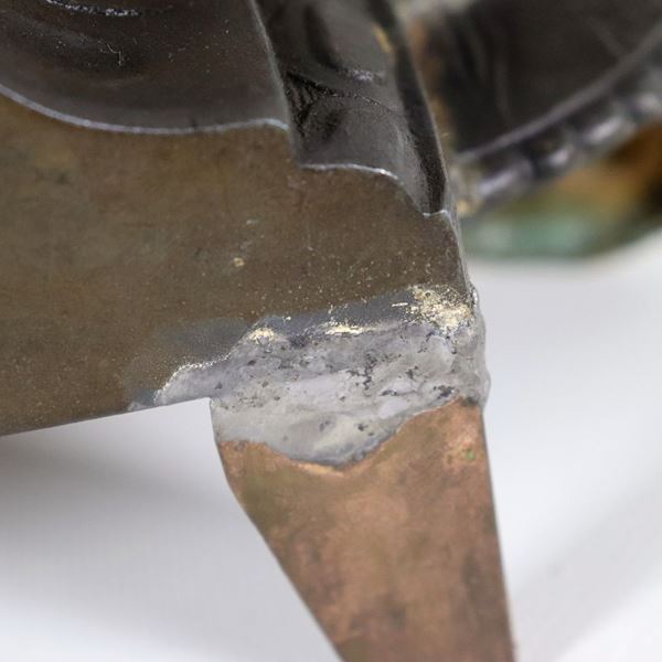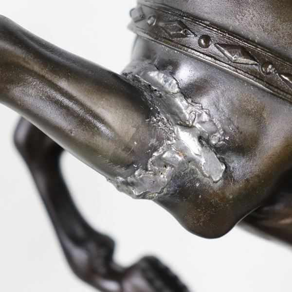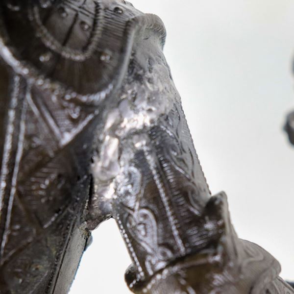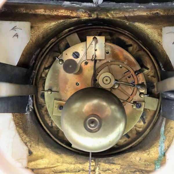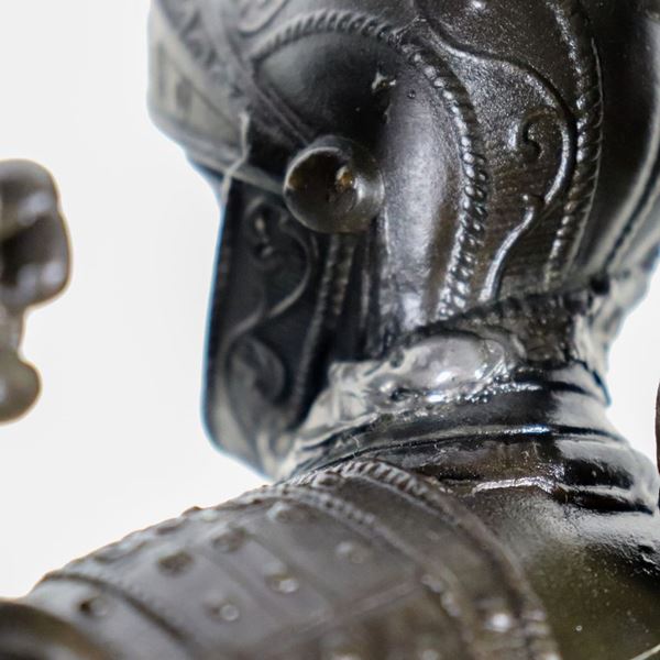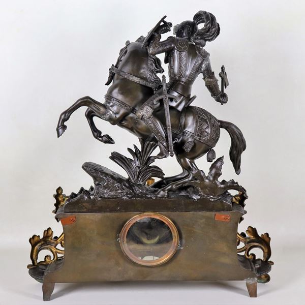 Antica pendola francese da tavolo in bronzo dorato e brunito, con scultura di cavaliere con armatura, quadrante dorato con cifre romane in sm [..]