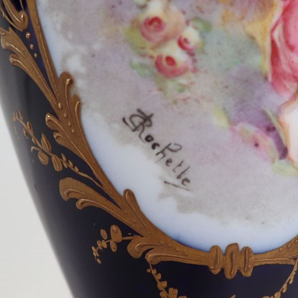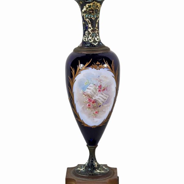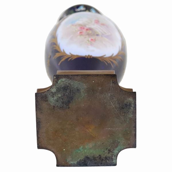 Antica piccola anfora in porcellana blu cobalto di Sèvres e smalti, con medaglioni variopinti "Dama e cupido" e "Mazzetti di rose con spartito [..]