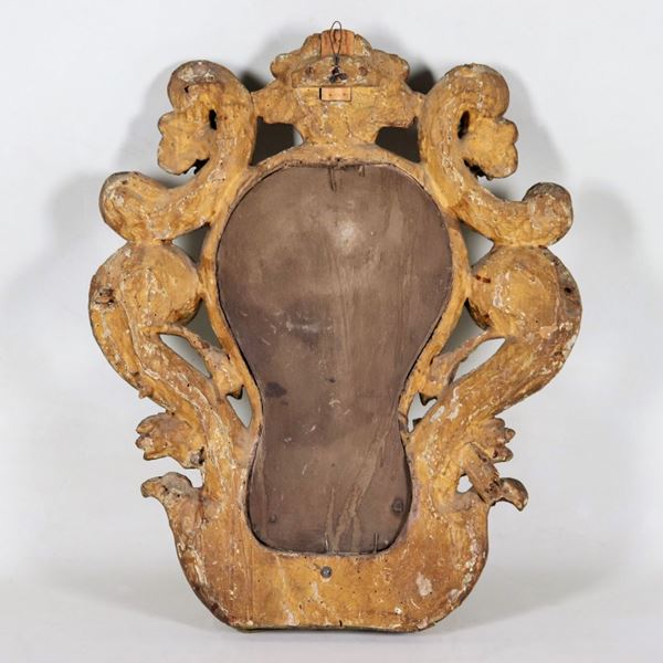 Antica specchiera in legno dorato a mecca e intagliato a motivi di ricci, volute e grappoli d'uva, specchio al mercurio e riduzione a luce elettrica [..]