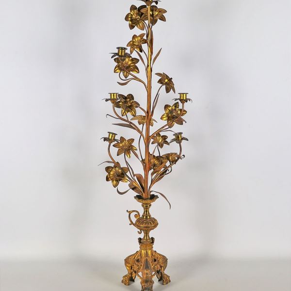Antico candelabro dorato in bronzo e rame, 6 fiamme