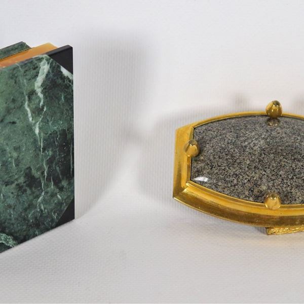 Antico lotto di un cestino in bronzo dorato e cesellato con piano in marmo serpentino e un fermacarte a forma di libro in marmo verde delle [..]