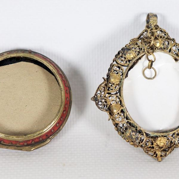 Antico lotto di un medaglione in metallo dorato e traforato con all'interno miniatura dipinta "Bambino con cagnolino" e un cameo con profilo [..]