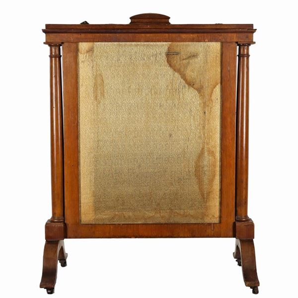 Antico parafuoco toscano in noce con pannello alzabile in tessuto ricamato a motivi di fiori