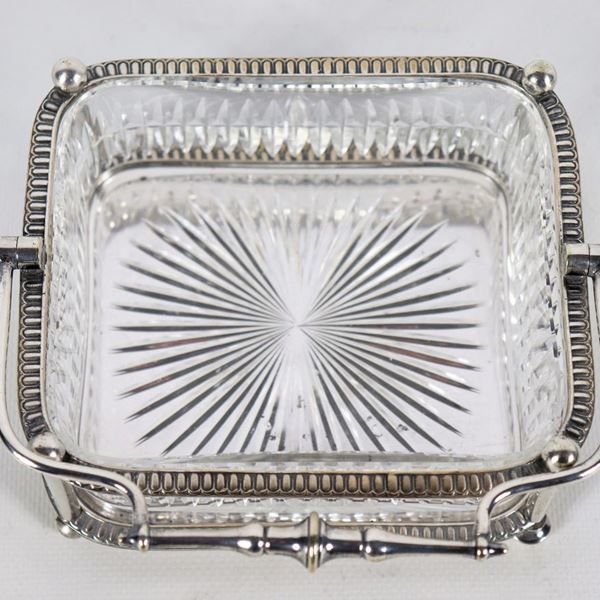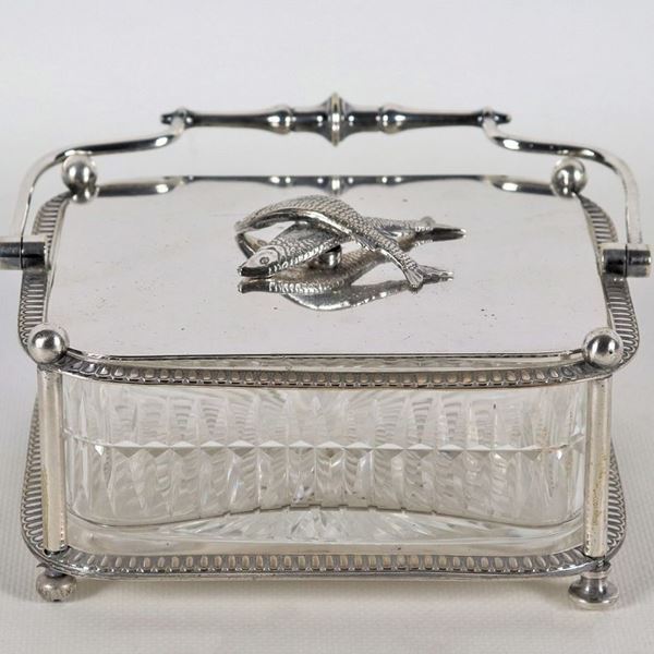 Antico porta maionese inglese in sheffield cesellato e sbalzato, con vaschetta in cristallo lavorato e pomo con due pesci