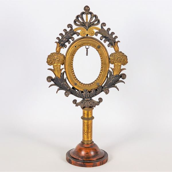 Antico portareliquie romano in bronzo patinato e dorato, sbalzato e cesellato a motivi di cornucopie con fiori e palmette