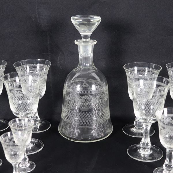 Antico servizio di bicchieri in cristallo, inciso a motivi di volute floreali e geometriche (42 pz)