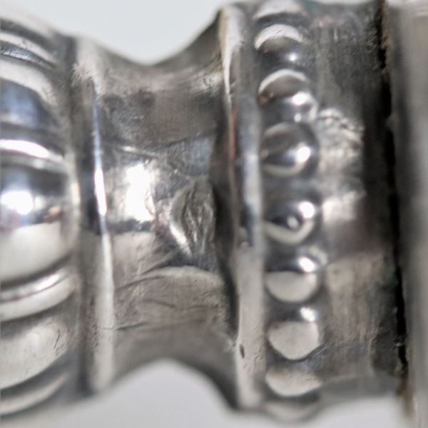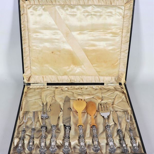 Antico servizio di dieci posate da portata con manici in argento, riccamente cesellato e sbalzato a motivi di intrecci floreali, mascheroni [..]