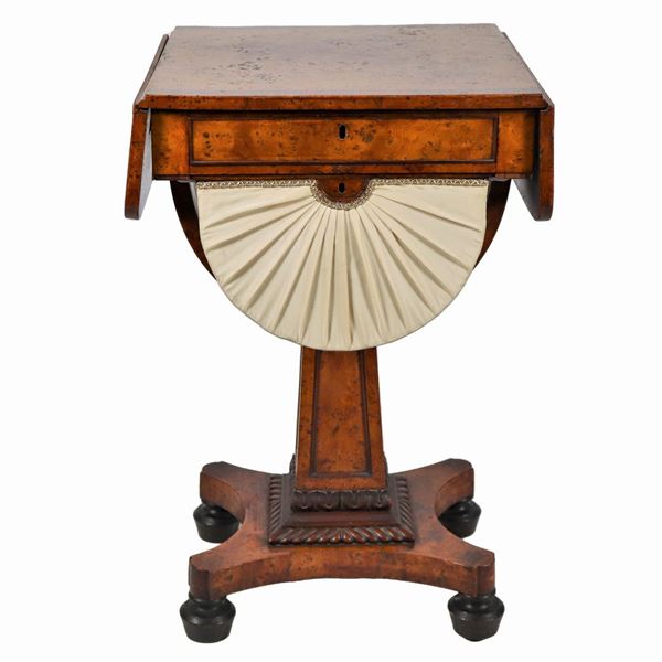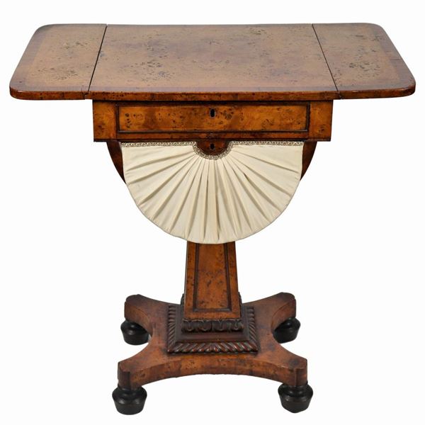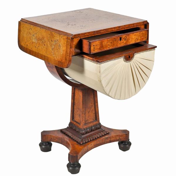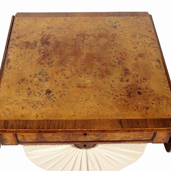 Antico tavolino da lavoro francese da centro in radica di tuja e noce, con tiretto centrale, scomparto estraibile e due bandelline ai lati, [..]