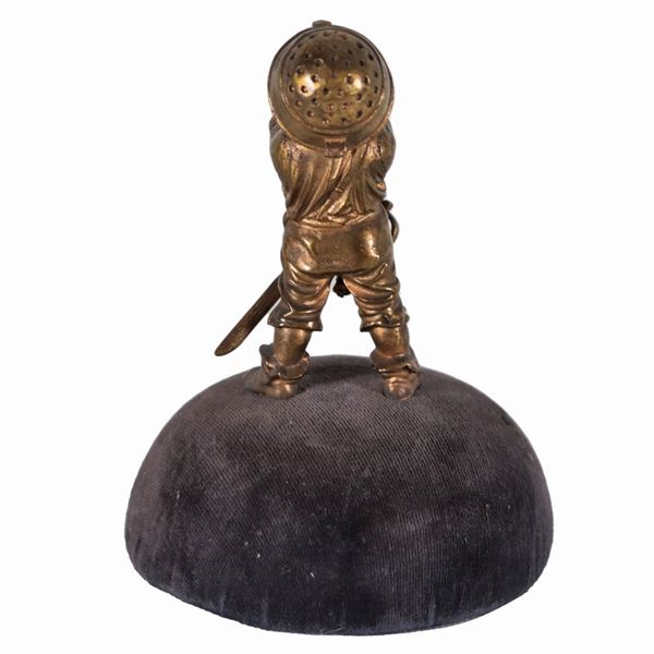 "Bambino in costume", antica piccola statuina in bronzo dorato, sbalzato e cesellato, basetta in legno ricoperta in velluto
