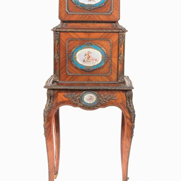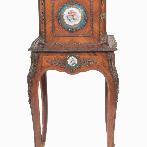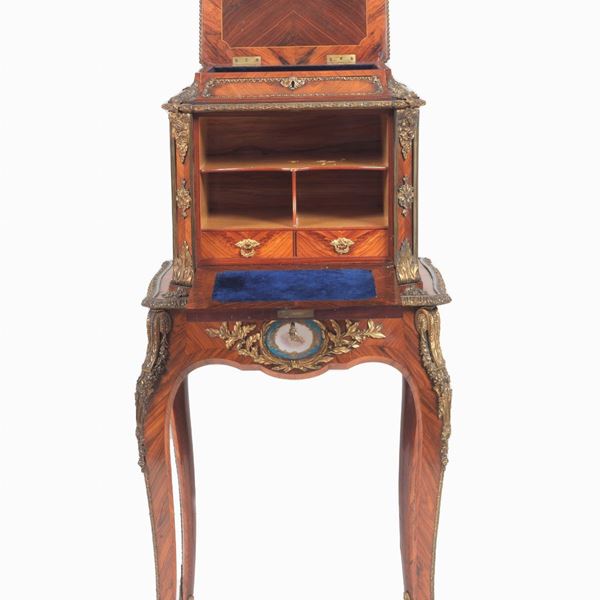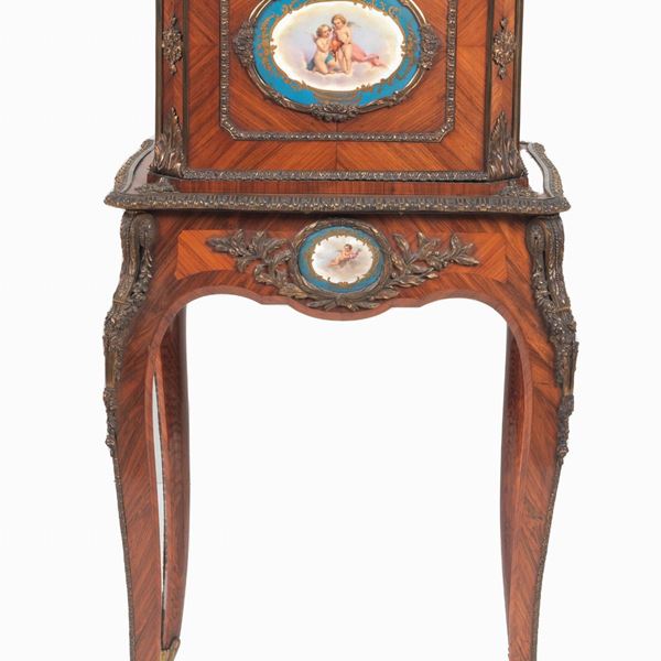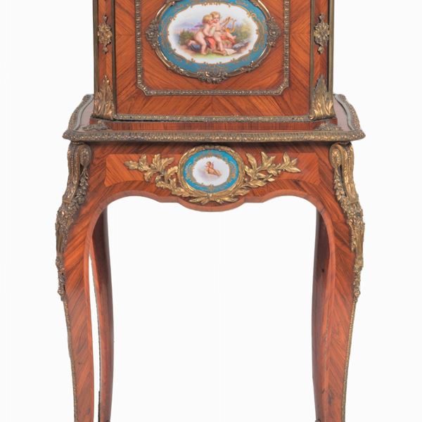 Bonheur du jour francese da centro Napoleone III (1852-1870) in ebano viola, con applicazioni di nove placche in porcellana di Sèvres dipinte [..]