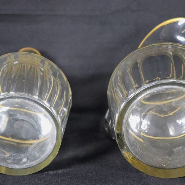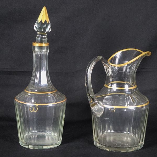 Brocca e bottiglia per vino in cristallo lavorato con filettature e monogramma dorati