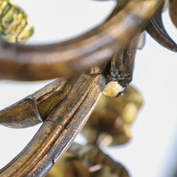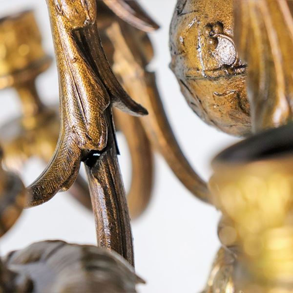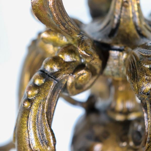 Candelabro francese in bronzo dorato e brunito, con scultura di putto che sorregge cornucopia, 7 fiamme
