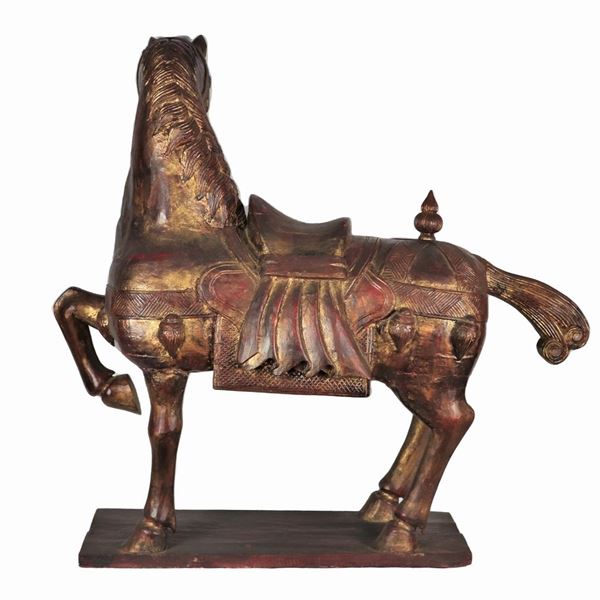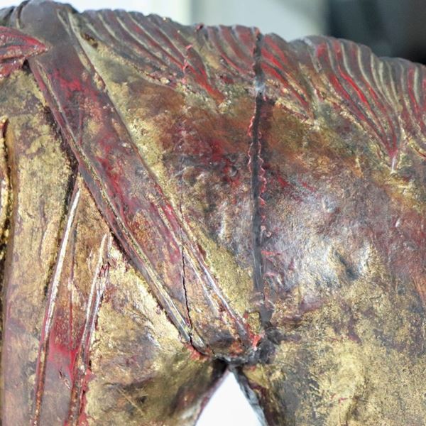 "Cavallo", grande scultura in legno policromo, difetto al collo
