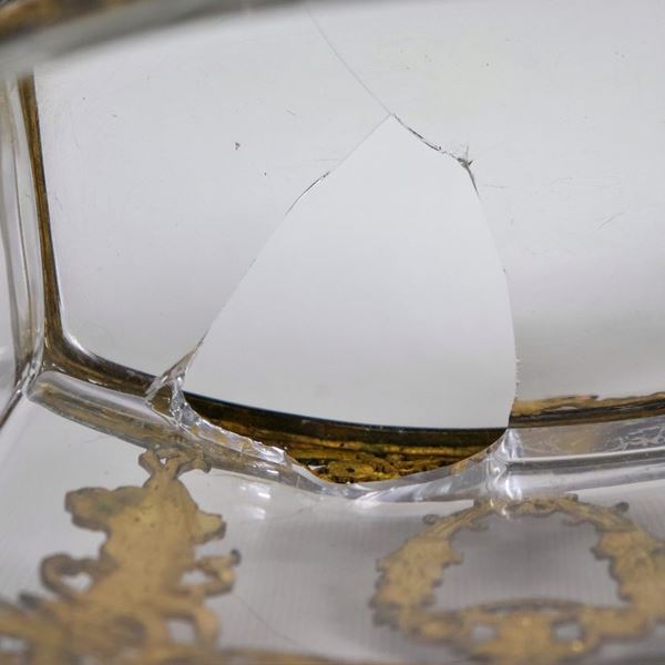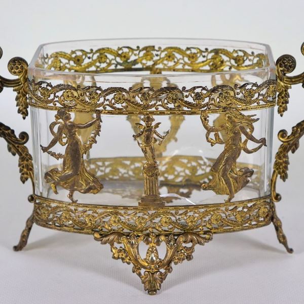 Centrotavola ovale francese in metallo dorato, cesellato e sbalzato a motivi Impero di vestali danzanti, putto e cornucopie, all'interno vaschetta [..]