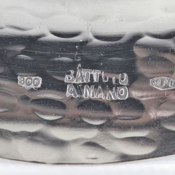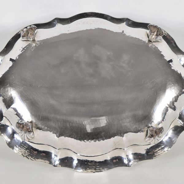 Centrotavola ovale in argento sbalzato e martellato, sorretto da quattro piedini leonini, gr. 520
