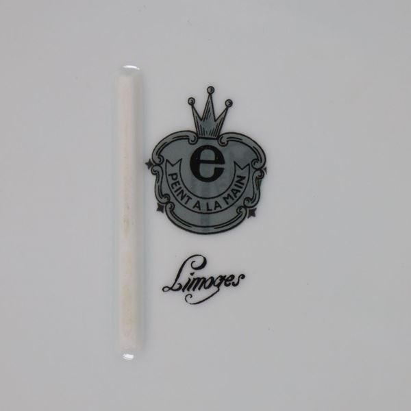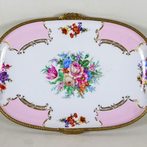 Centrotavola ovale in porcellana policroma di Limoges con decorazioni a rilievo a motivi di mazzetti di fiori, manici, bordo e quattro piedini [..]
