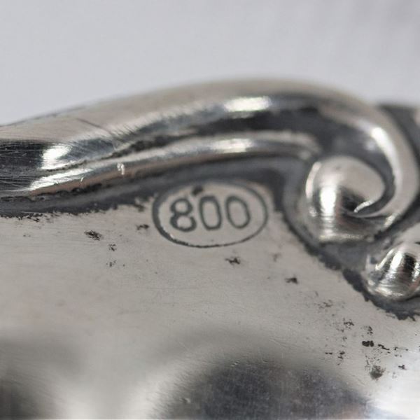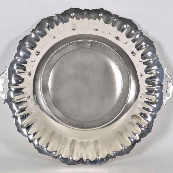 Centrotavola tondo in argento con bordo centinato e sbalzato a motivi di conchiglie e volute, due manici, gr. 365