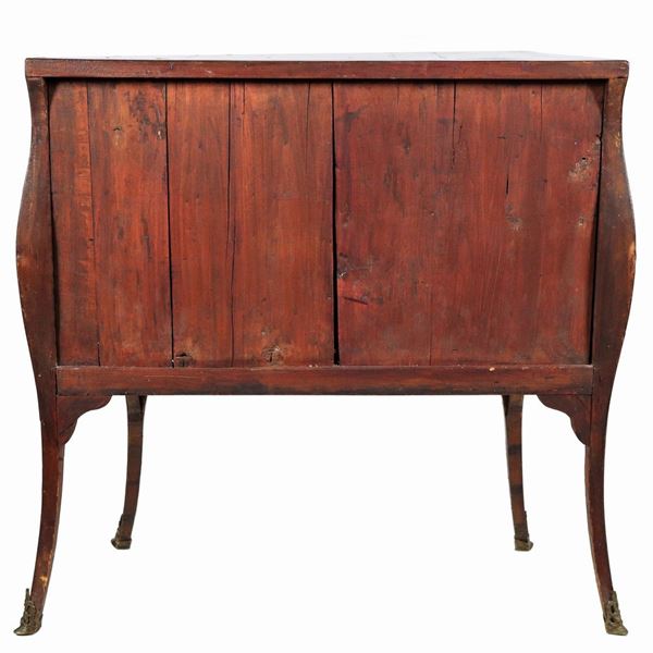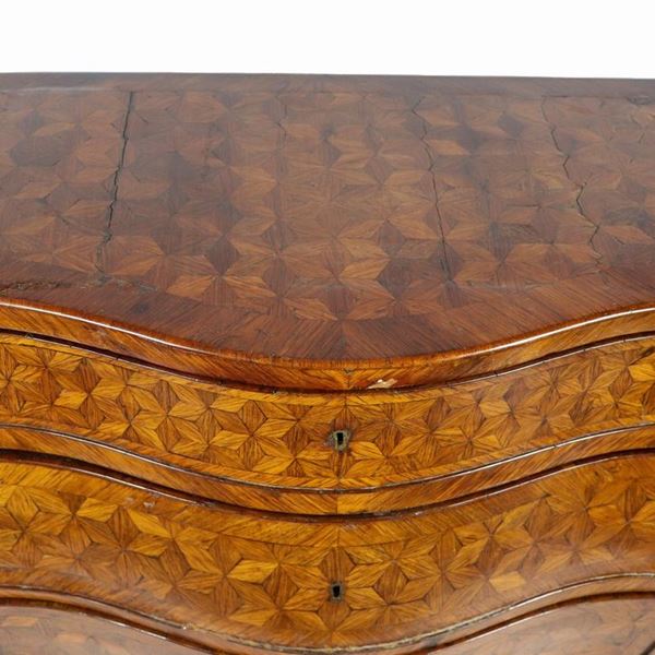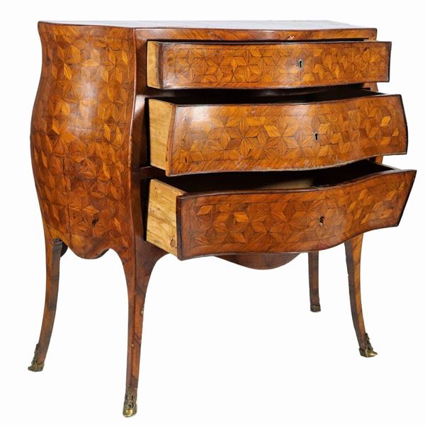 Comò ligure a forma mossa bombata in ebano viola e bois de rose, interamente intarsiato a marqueterie geometriche, tre tiretti e quattro gambe [..]