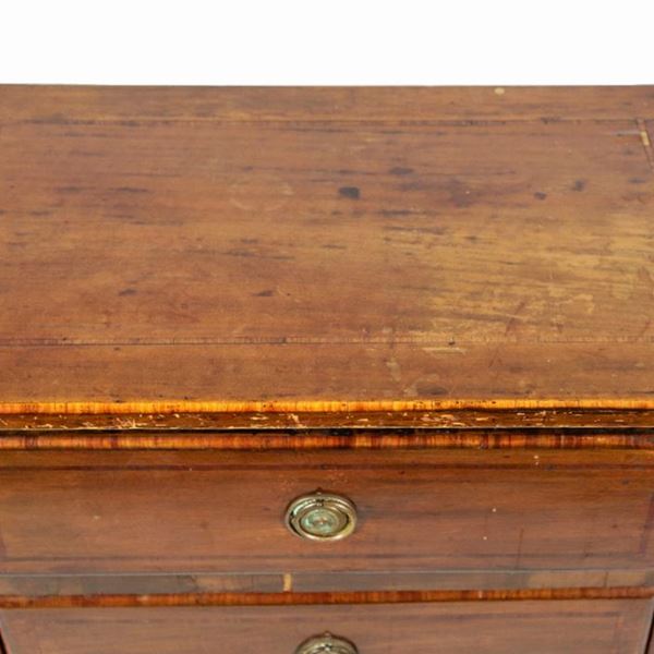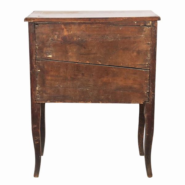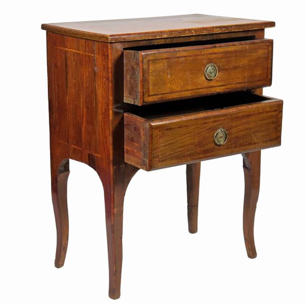 Comodino romano in noce, con filettature intarsiate in bois de rose, due tiretti e quattro gambe ricurve