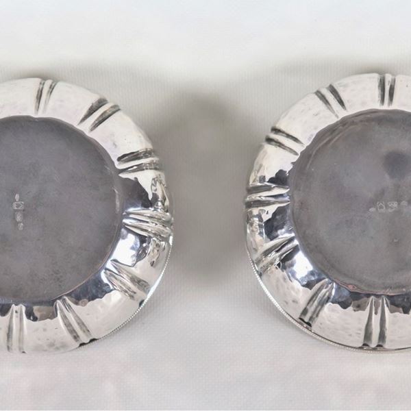 Coppia di antiche piccole ciotole tonde in argento cesellato, sbalzato e martellato, gr. 310
