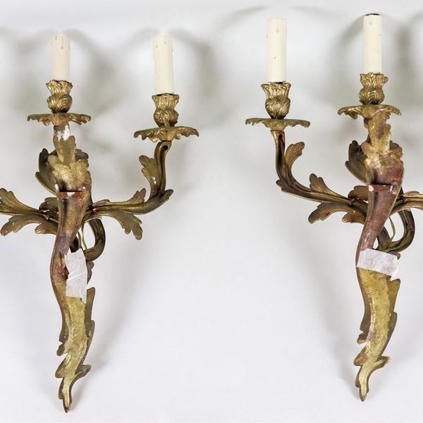 Coppia di appliques francesi in bronzo dorato e sbalzato a motivi Luigi XV, 3 luci ciascuna
