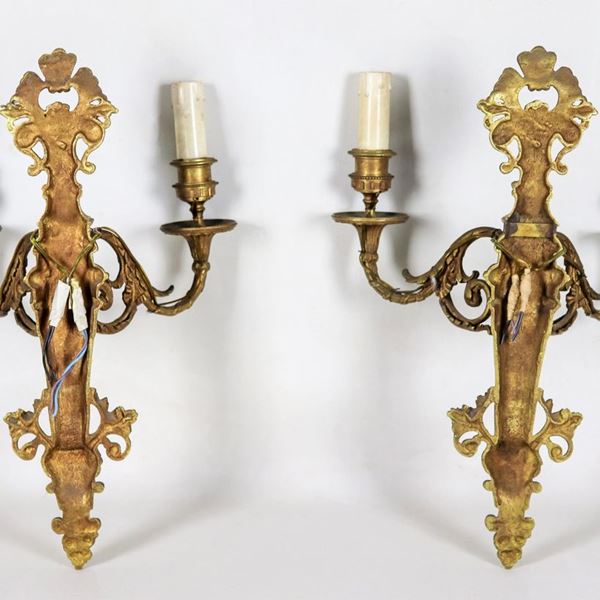 Coppia di appliques francesi in bronzo dorato, sbalzato e cesellato con mascheroni, 2 luci ciascuna