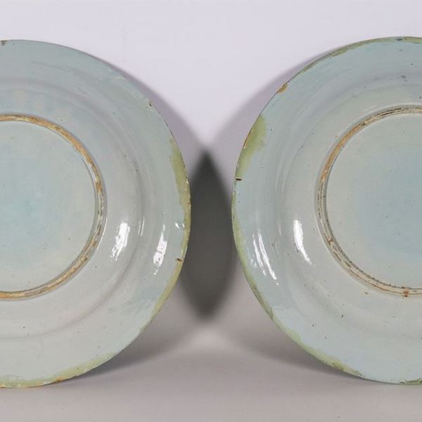 Coppia di piatti da muro in porcellana, con decorazioni in blu a motivi di chinoiserie, sui bordi qualche lieve difetto e un vecchio restauro [..]
