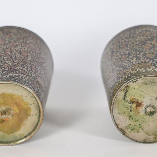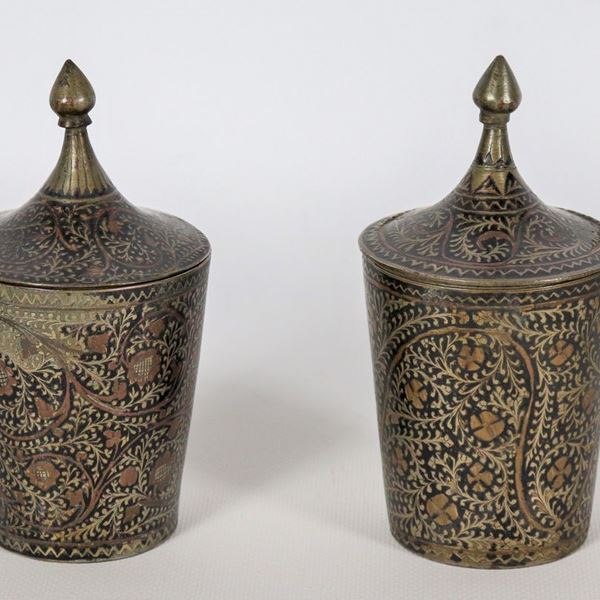 Coppia di piccoli vasi orientali in metallo bronzato, interamente decorati a rilievo a volute floreali