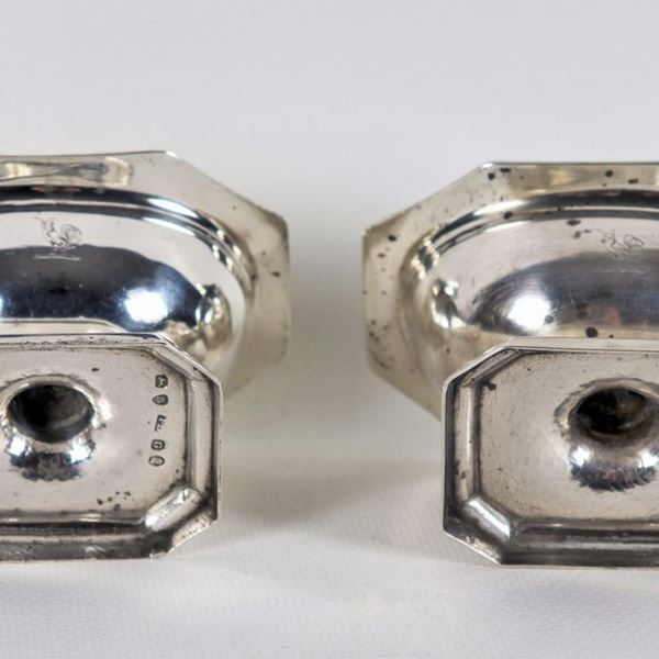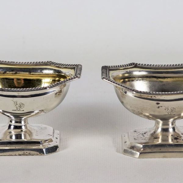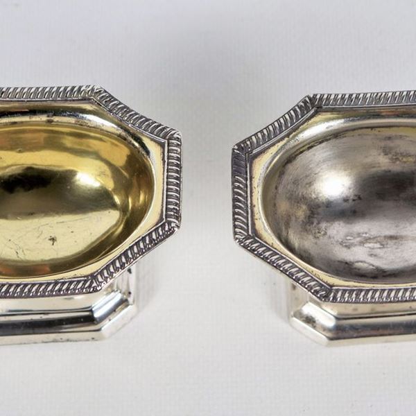 Una salierina con vermeil all'interno, cm 8,5 x 6,5 x 5,5 h ciascuna.