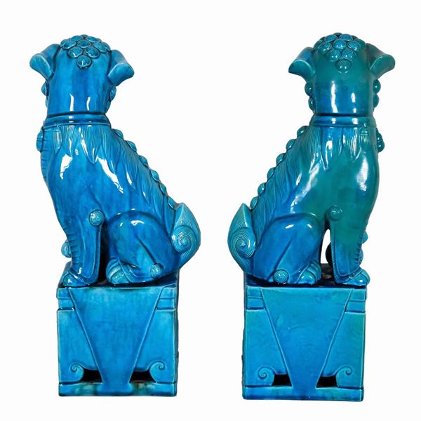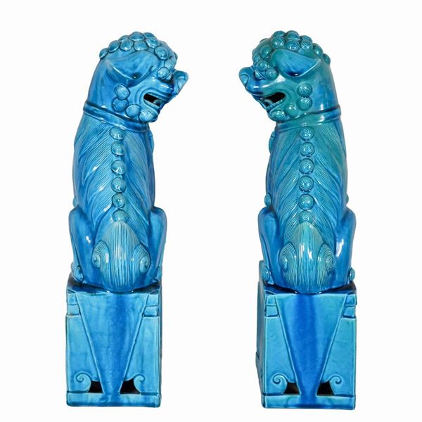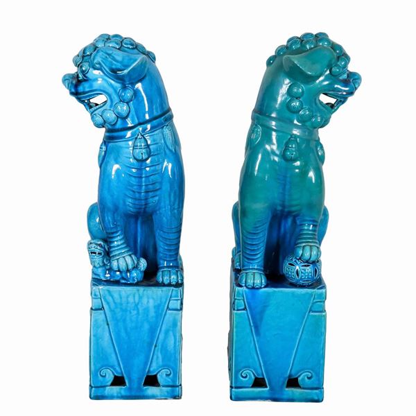 Coppia di sculture cinesi "Cani Foo" in porcellana azzurra