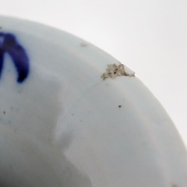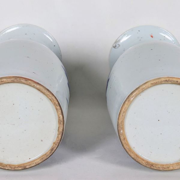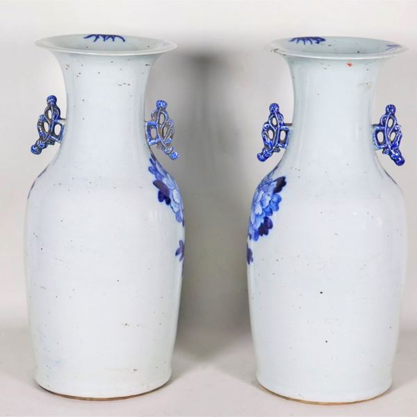 Coppia di vasi cinesi in porcellana con decorazioni in blu a motivi di fiori esotici e pappagalli, lieve sbeccatura al collo di un vaso
