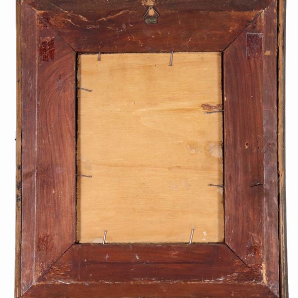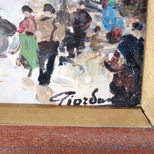 Firmato. "Scorcio di vie di Napoli con figure", piccolo dipinto ad olio su tavoletta