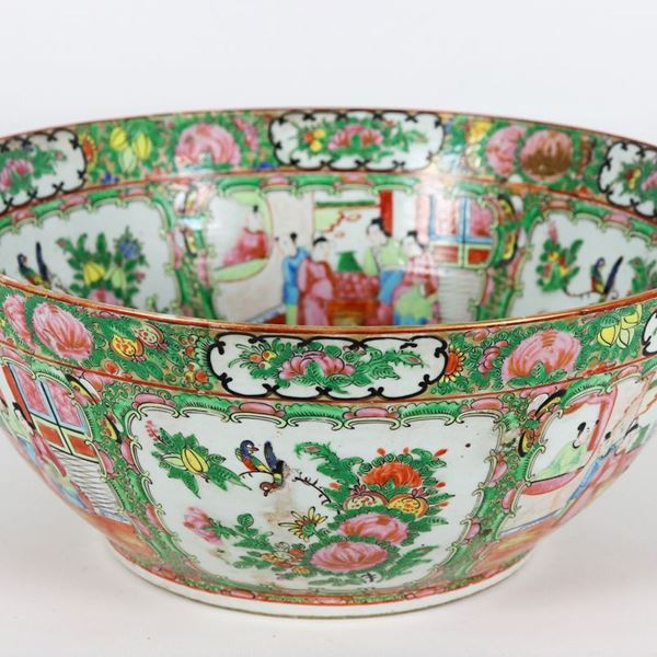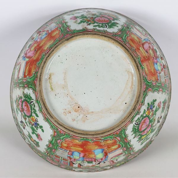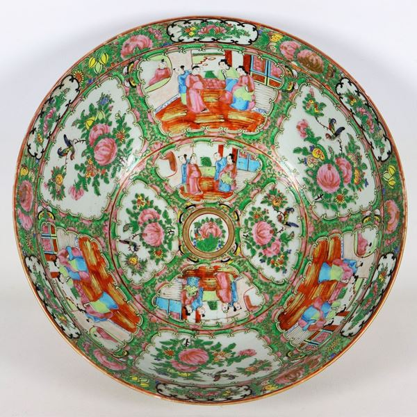Grande ciotola cinese in porcellana Canton, interamente decorata in smalti policromi a rilievo con scene di vita orientale, fiori e uccelli [..]