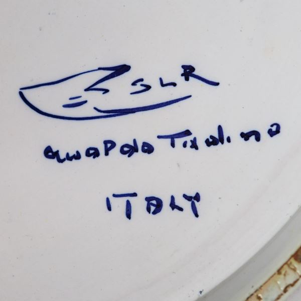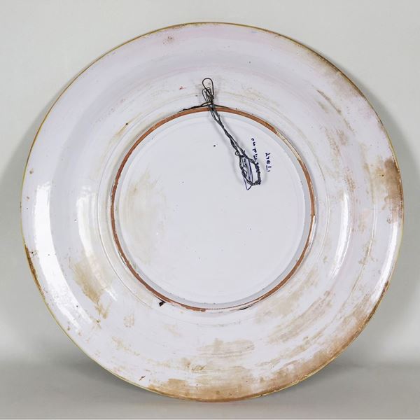 Grande piatto da parata S.C. Robbia Gualdo Tadino con al centro scena mitologica a varie policromie, bordo a motivi di draghi e cariatidi