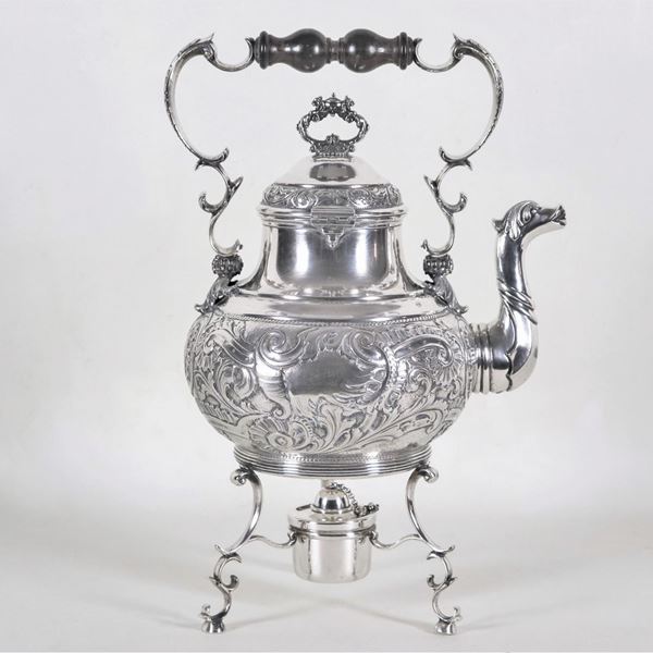 Grande samovar in argento con spiritiera, cesellato e sbalzato a motivi di volute di foglie d'acanto e manico in legno tornito, gr. 1690