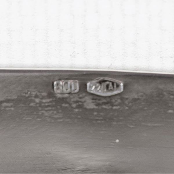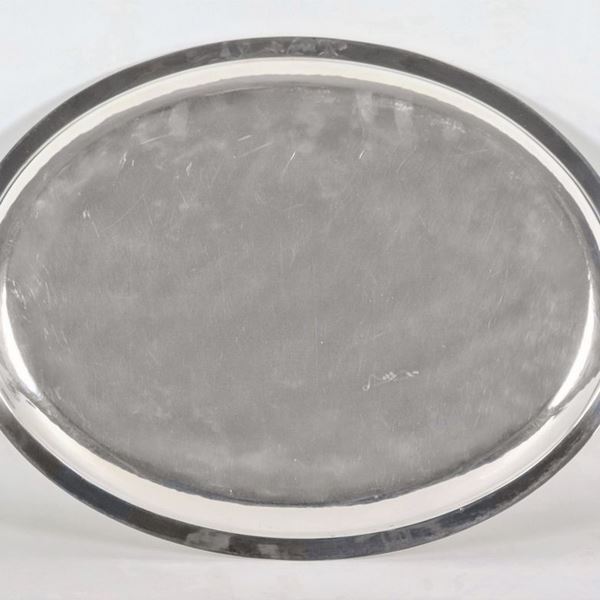 Grande vassoio ovale in argento con manici e bordi cesellati e sbalzati a motivi Impero, gr. 1850