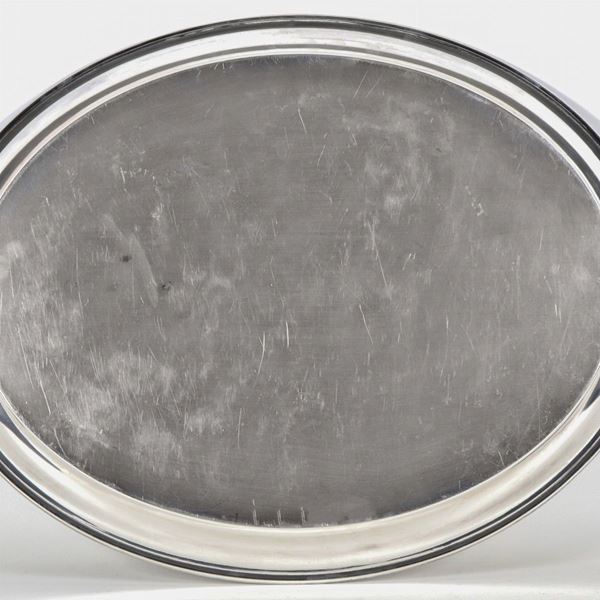 Grande vassoio ovale in metallo argentato, con fondo cesellato a volute floreali e monogramma centrale
