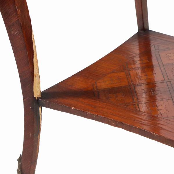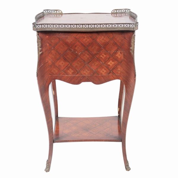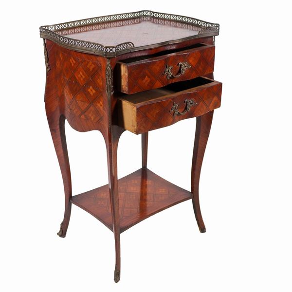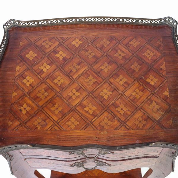 Gueridon francese rettangolare di linea Luigi XVI in mogano e bois de rose, con intarsi a marqueterie, pianetto con ringhierina, fregi e guarnizioni [..]