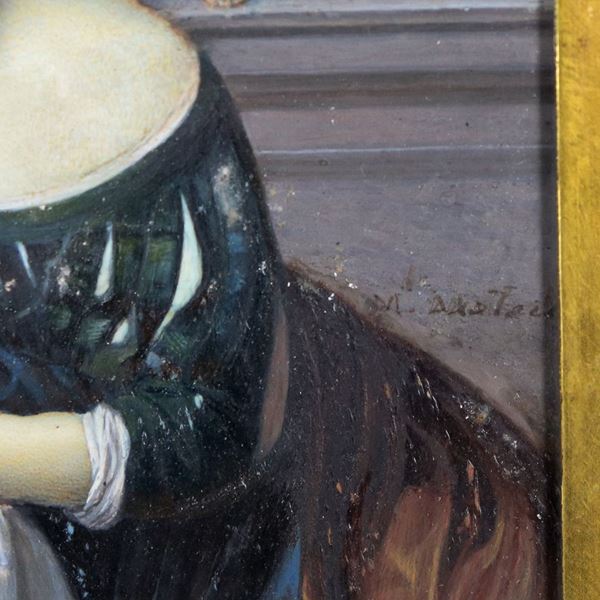 "Il principino mostra alla governante il pesce catturato", miniatura firmata dipinta ad olio su carta di fine e pregevole qualità pittorica