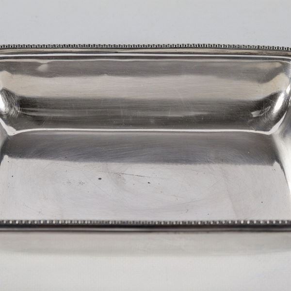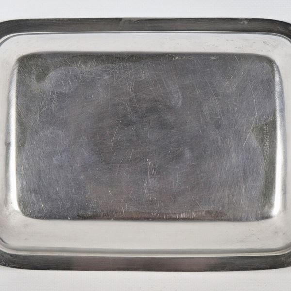 Legumiera rettangolare in metallo argentato, con due manici ricurvi e pomo a forma di anfora
